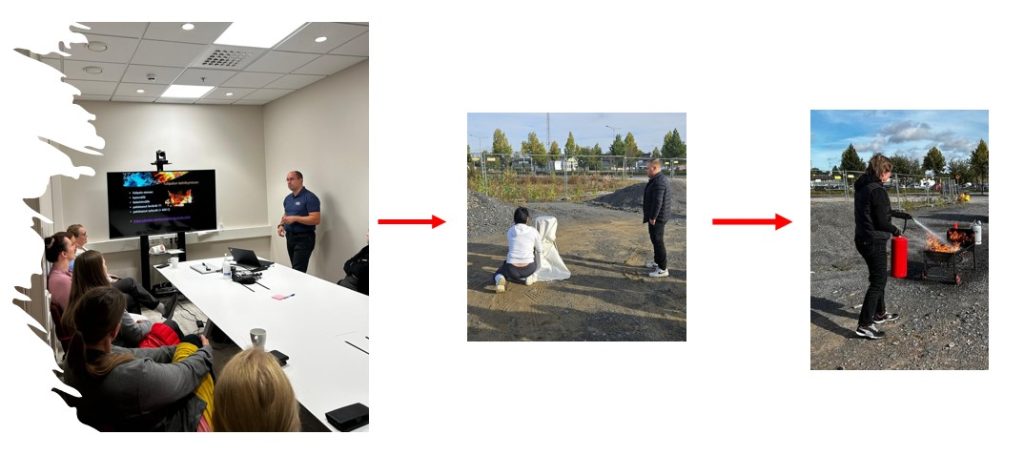 3. Koulutuspäivä – sisältää teoriaosuuden ja käytännön harjoittelun oikeilla sammutusvälineillä.